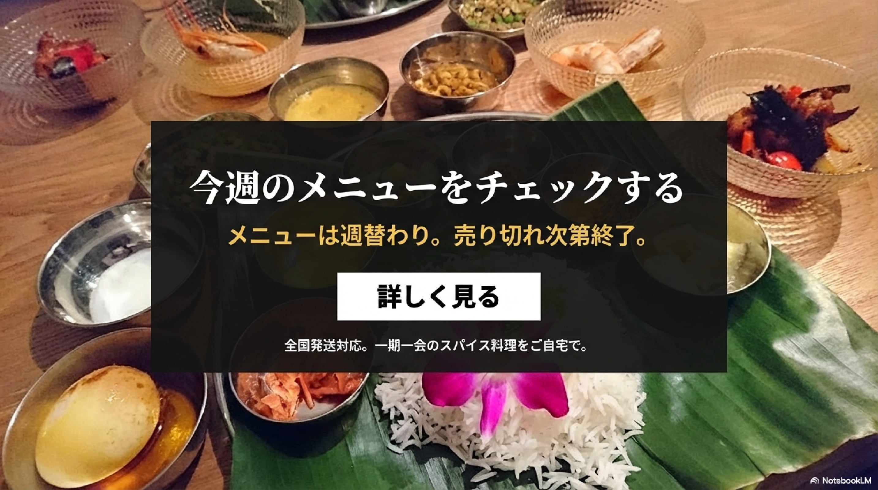 大阪の熱気を、そのままご自宅へ。 袋を開けた瞬間に広がる、五感を刺激するスパイスの魔法。 「どれを選べばいいか迷う」「色々な味を一度に楽しみたい」 そんなお客様の声にお応えして、シェフが自信を持ってお届けする定番から季節の味まで、相性抜群のバナナ包み弁当を6つ厳選しました。 通常11000円のところ、セット限定の特別割引価格でご提供。さらに全国どこでも送料無料でお届けします。 お召し上がり方は簡単。電子レンジ(600w)で7〜8分温めるだけで、いつもの食卓が特別なスパイスレストランに早変わりします。 まずは一つずつ個性豊かな香りを楽しみ、最後は少しずつ混ぜ合わせて複雑なスパイスのレイヤー(層)をご堪能ください。初めての方にも、常連様にも自信を持っておすすめする、通販限定の至福のセットです。 ※バナナの葉で香りと旨味を完全に閉じ込め、急速冷凍でお届けします。 ※アレルギーなどがあるお客様は購入時の備考にご記入ください。