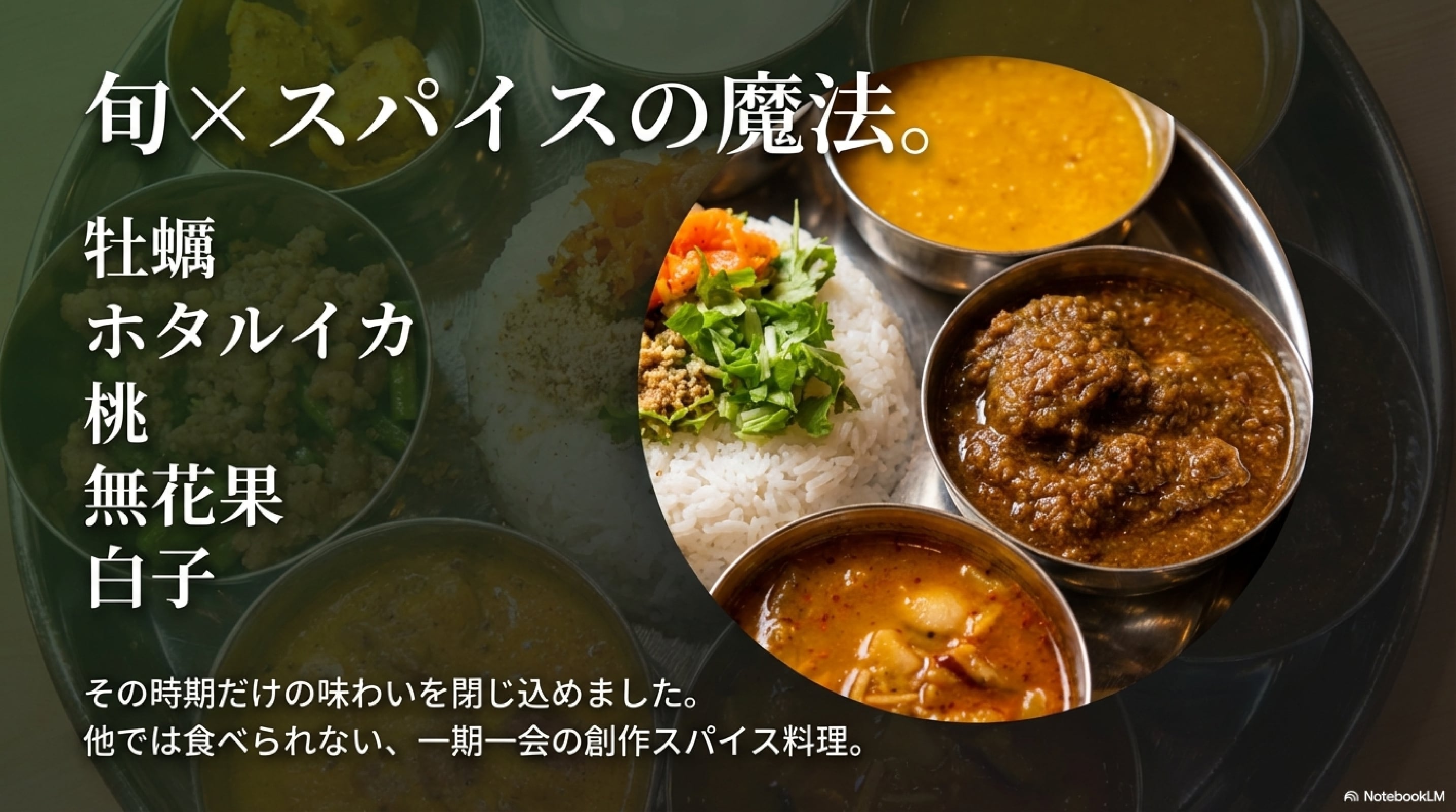 甘み、酸味、辛味、旨味が口の中で重なり合い、一口食べるごとに表情を変える「味とスパイスの香りのマリアージュ」をご堪能いただけます。食べ進めるほどに深まる、複雑で奥深い至福のスパイス体験をお楽しみください。